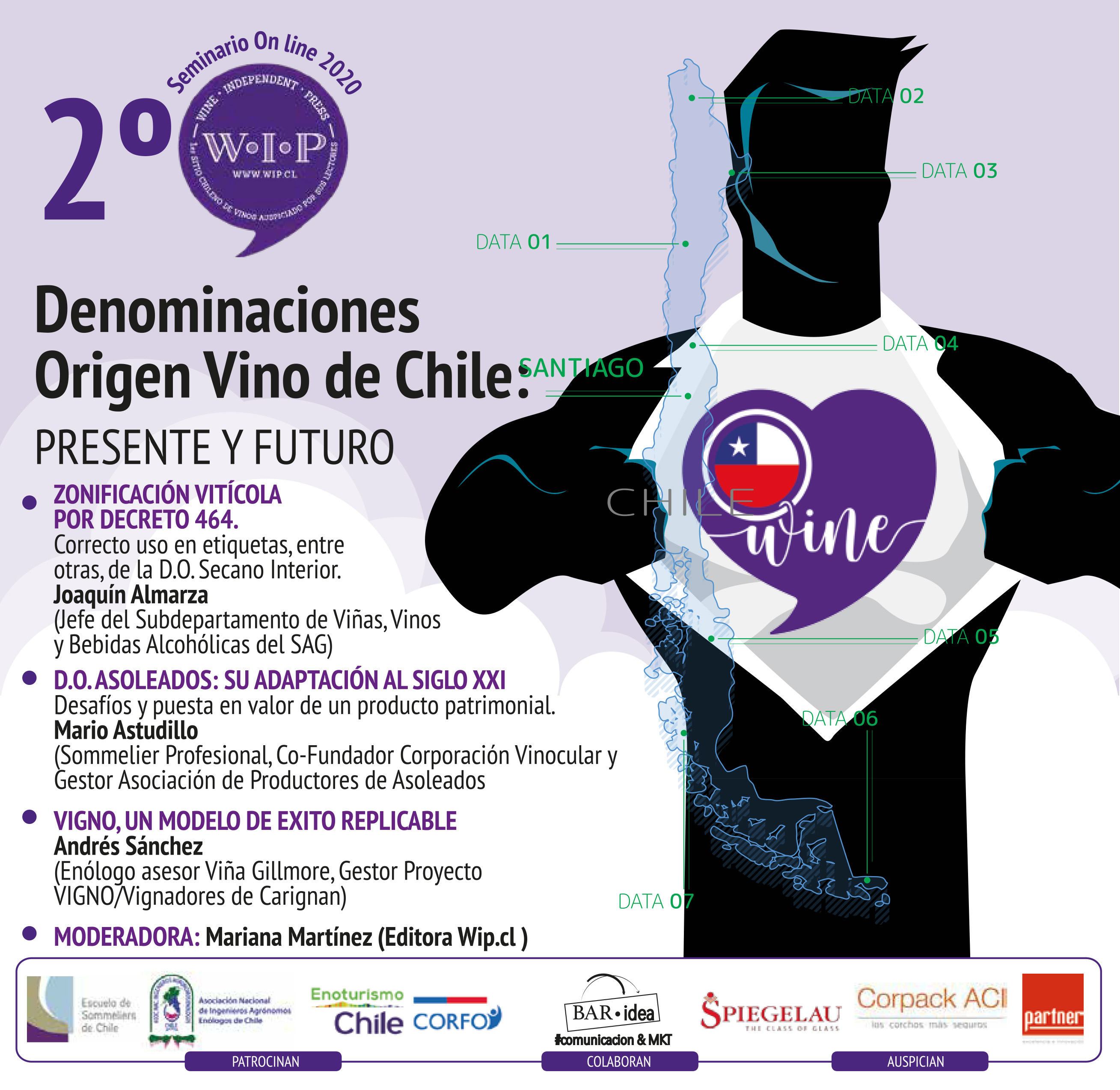 Agradecemos a nuestros auspiciadores CorpackACi, Spiegelau / Eurohome.cl y Partner Chile SA, así como la colaboración de @Bar.Ideas por haber interpretado el objetivo de nuestros Seminarios On-line WiP 2020. Aunque el corazón con la bandera de Chile es parte de otro proyecto 2020 y obra de otra gran colaboradora WiP Bianca Sartori (autora de El Vino de la A a la Z, y nuestro querido logo WiP.cl). Aprovechamos de contarles que BarIdeas es un emprendimiento de Carolina Leiva, diseñadora gráfica quien por 8 años trabajó en exclusiva para Viña Casa Donoso; hoy inicia este de proyecto de asesorías, estrategias de posicionamiento comunicacional, relato y look & feeld de marca.