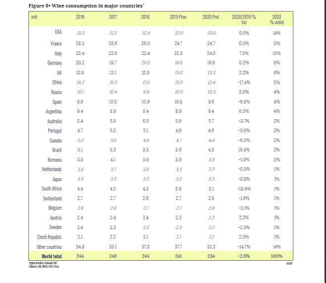 PAÍSES CON MAYOR CONSUMO DE VINO/CIFRAS OIV 2020