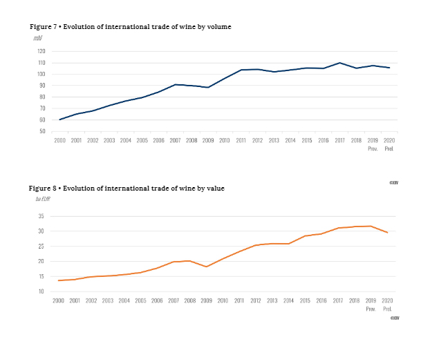 Los gráficos con cifras OIV 2020 muestran la baja de un 3% volumen de vino producido mundialmente en 2020, versus la mayor baja de un 7% en valor  para el mismo año (período entre los años 2000 al 2020).