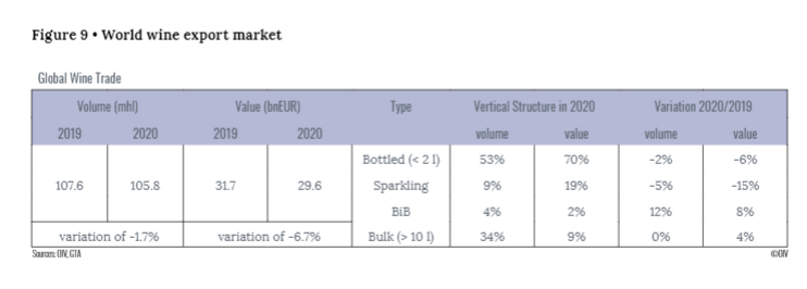 Por el contrario, las ventas de vino bag-in-box (BiB) experimentaron un fuerte aumento en ventas, aunque los volúmenes generales siguen siendo bajos (como muestra gráfico superior). Vale destacar sí, que la categoría BiB representa el 4% en volúmenes de exportación y 2% del valor total y que en 2020 esta categoría experimentó la mayor expansión en comparación a los otros tipos de productos en términos de volumen (+12%) y valor (+8%) en comparación con 2019.
