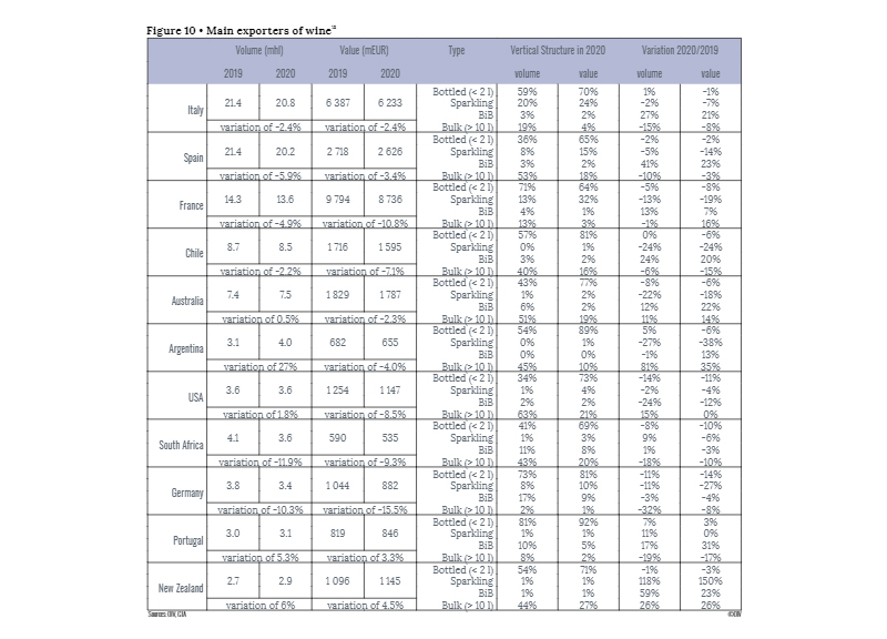 • Francia volvió a ser el primer exportador mundial en 2020, aunque con caída de un 10,8%. También, hubo grandes caídas en varios más de los principales países exportadores: Alemania (-16,0%/2019), Italia (-2%/2019), Chile (-7%/2019), EE.UU. (-9%/2019) y España (-3%/2019).