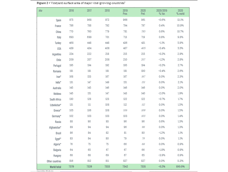 Las cifras 2020 de la OIV muestran que al fin la superficie del viñedo mundial pareciera haberse estabilizado desde 2017, tras la caída provocada por la importante reducción de la superficie de viñedo en países como Irán, Turquía, Portugal, Uzbekistán y EE.UU. La estabilización actual, sin embargo, esconde evoluciones heterogéneas en diferentes regiones del mundo (ver detalles en gráficos país por país más adelante).