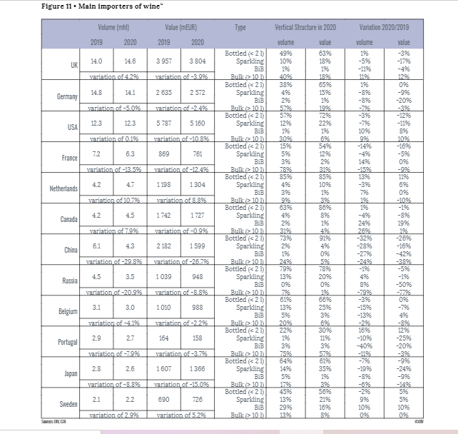 • El mayor importador por volumen en 2020 es el Reino Unido, con 14,6 Mhl, (+4%/2019) y ocupa el segundo lugar en términos de valor con importaciones de vino de 2020 por valor de 3,8 mil millones de euros (-4%/2019).