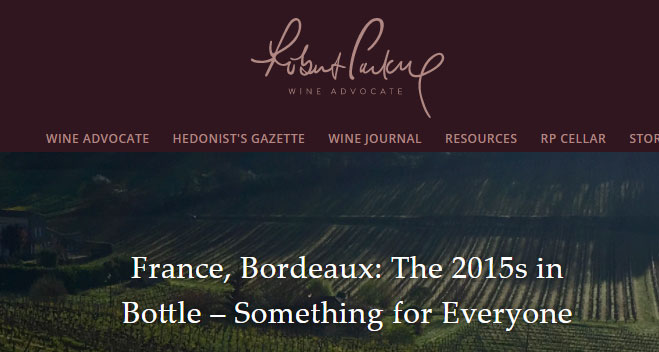 En su debut de esta semana sobre los vinos de Burdeos, la MW Perroti-Brown (quien cubre ademas los vinos de Napa, Sonoma County, Oregon y la Costa Central de California) otorgó los perfectos 100 puntos a tres vinos, los tres de la cosecha 2015, considerada por el mismo Parker como la mejor desde 2010. Estos tres vinos de Burdeos con 100 puntos son: