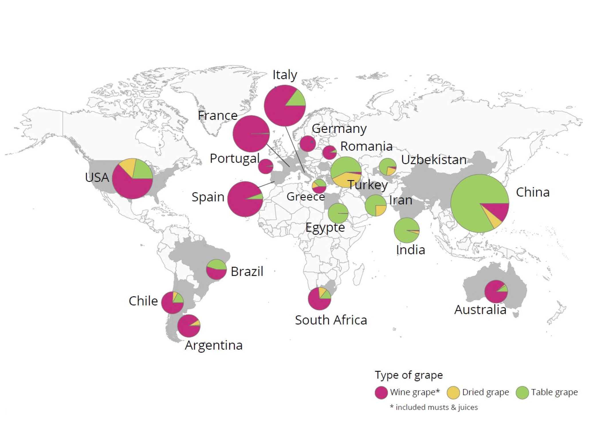 El siguiente mapa muestra cómo cada país distribuye su producción de uvas, según sean destinadas a mesa (consumo fresco), vino o pasas.