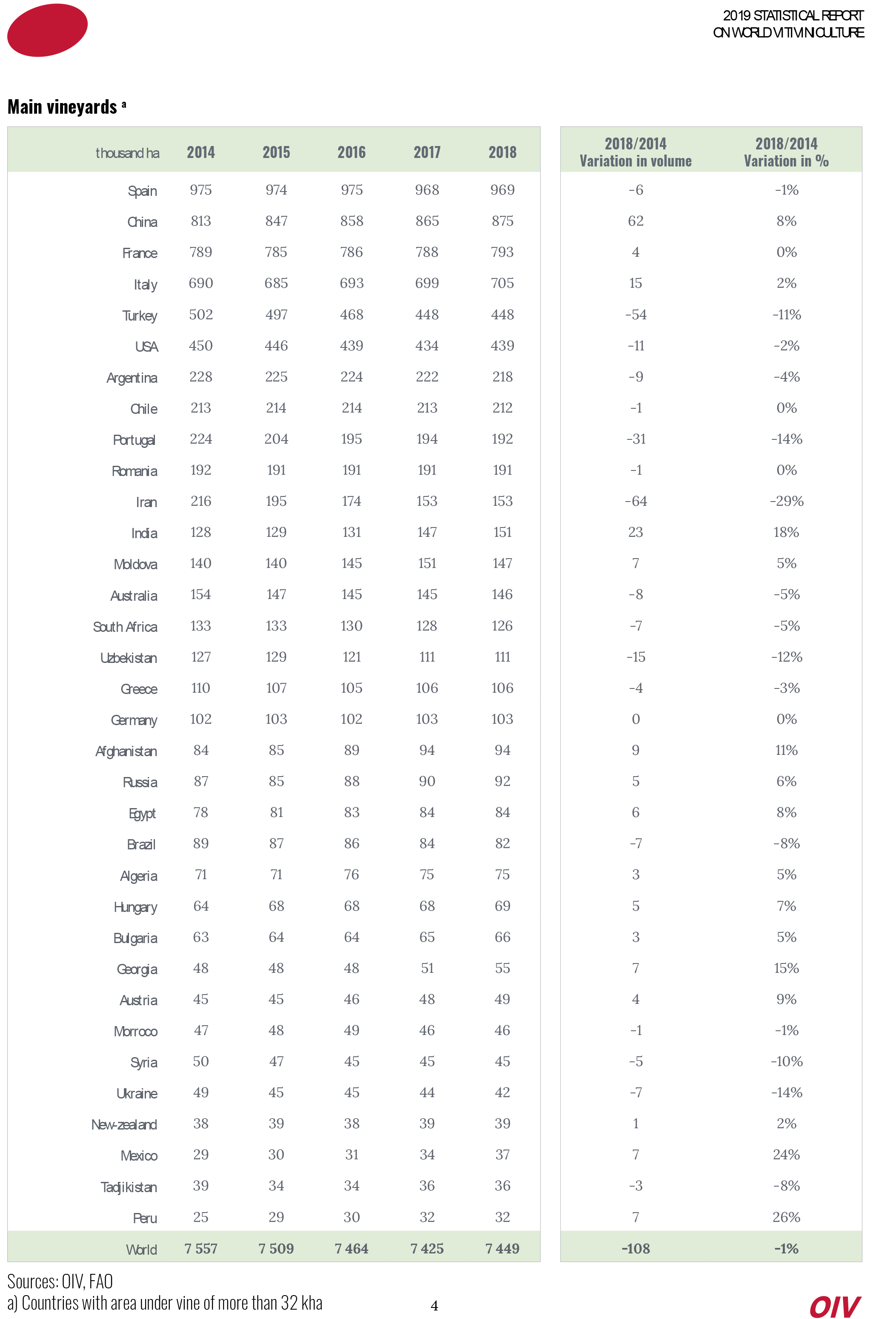 El informe OIV da cuenta además, de que la producción mundial de vino (excluidos zumos y mostos) en 2018  es una de las más elevadas desde el año 2000, con un volumen de 292 Mill. hL, o sea, un aumento del 17% con respecto a 2017. El informe OIV recuerda que el año 2017 estuvo marcado por condiciones climáticas muy difíciles que afectaron la producción de muchos países. Italia (54,8 Mill. hL) confirma su puesto de primer productor mundial de vino, seguida por Francia (48,6 Mill. hL) y por España (44,4 Mill. hL).