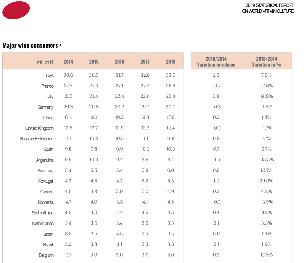 Estados Unidos, con 33 Mill. hL confirma su posición de primer consumidor mundial desde 2011, seguido de Francia (26,8 Mill. hL), Italia (22,4 Mill. hL), Alemania (20 Mill. hL) y China (17,9 Mill. hL). El Reino Unido, una vez número uno, hoy está en número 6 con una baja del 0,2 en volumen y -1,7 en porcentaje. Argentina, también se muestra a la baja, en el número 9 de la lista, con una baja de 1,5 en volumen y -15,5 en porcentaje.