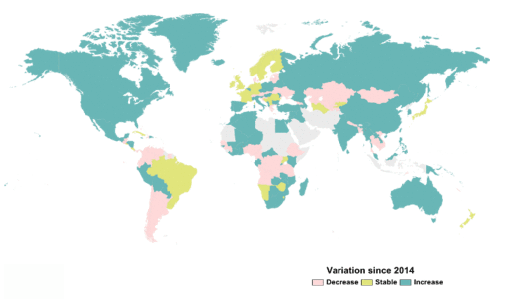 El gráfico a continuación muestra cuáles son los países que crecen (en verde agua), se estancan (en amarillo), o disminuyen (rosado) en cuanto a viñedos se refiere desde 2014. Curiosamente, sin duda, si bien las hectáreas disminuyen, en Chile y Argentina sus producciones en volumen aumentan.
