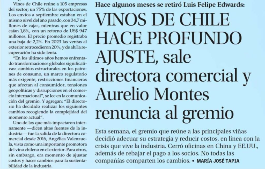 El mensaje se enmarca en uno de los ajustes más profundos realizados por la entidad en los últimos años, incluyendo la salida de Angélica Valenzuela —directora comercial desde 2016—, tanto como el cierre de oficinas en Estados Unidos (el que se sumará al cierre -a inicios de este año- de la oficina en China. Así como a una reducción en las cuotas que pagan las viñas 105 socias.