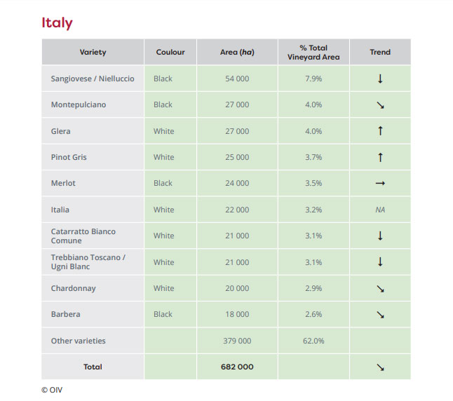 Este estudio de la OIV encontró que Rumania, Italia, Grecia, Hungría y Portugal tienen la mayor diversidad de variedades en sus viñedos, la mayoría con plantaciones específicas de cepas originarias del país particular, llamadas nativas. El patrón de distribución en cada uno de estos países es totalmente único, y ninguno de sus principales variedades de vid representan más del 10% del área nacional del viñedo.