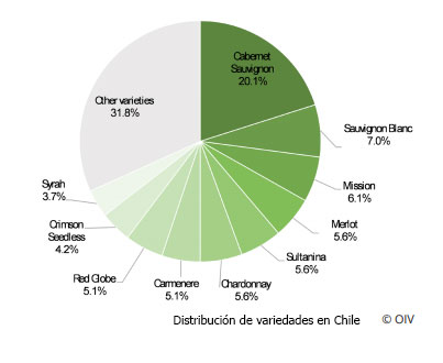 La distribución de variedades en Chile (basado de seguro en cifras aportadas por el SAG) se caracteriza según especifica informe OIV por la presencia de una sola vid en sus viñedos, Cabernet Sauvignon, la que ocupa aproximadamente 20% del área de viñedos del país. El 80% restante está dividido, se explica, relativamente uniforme entre las otras variedades, sin una variedad única superior al 7% del área total. Las variedades que han experimentado el mayor crecimiento en los últimos 15 los años en el viñedo chileno son Syrah, Sauvignon Blanc y Carmenère. Este aumento está en línea con la tendencia general de fuerte crecimiento de superficie plantada con vides, aumentando casi un 18% en 15 años. Curioso que en la tabla que compartimos a continuación, la cepa País, llamada por la OIV Mission, sea considera uva rosada. ¿Habrá sido acaso, nos preguntamos, un error?