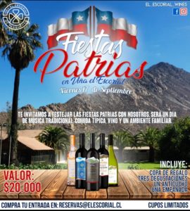 En el Valle Aconcagua. La Viña El Escorial, ya conocida por su ambiente familiar lleno de chilenidad, abrirá su casa el viernes 17 de septiembre a partir de las 12:00 para celebrar Fiestas Patrias como se debe. La entrada tiene un valor de $20.000 p/p e incluye: 3 degustaciones de sus vinos, copa de la viña de regalo, una empanada de horno y un anticucho, además del ambiente con bailes, presentaciones, artesanos y música chilena en vivo. A los menores de 18 años $10.000, se cambia las 3 degustaciones de vino por un vaso de jugo. Menores de 5 años no pagan entrada. Ojo, el ingreso con pase de movilidad es obligatorio para mayores de 18 años. Oferta especial: Si en la misma reserva juntan un buen equipo de 4 personas, tendrán una degustación de vino más para cada uno. Más datos y reservas al mail reservas@elescorial.cl.
