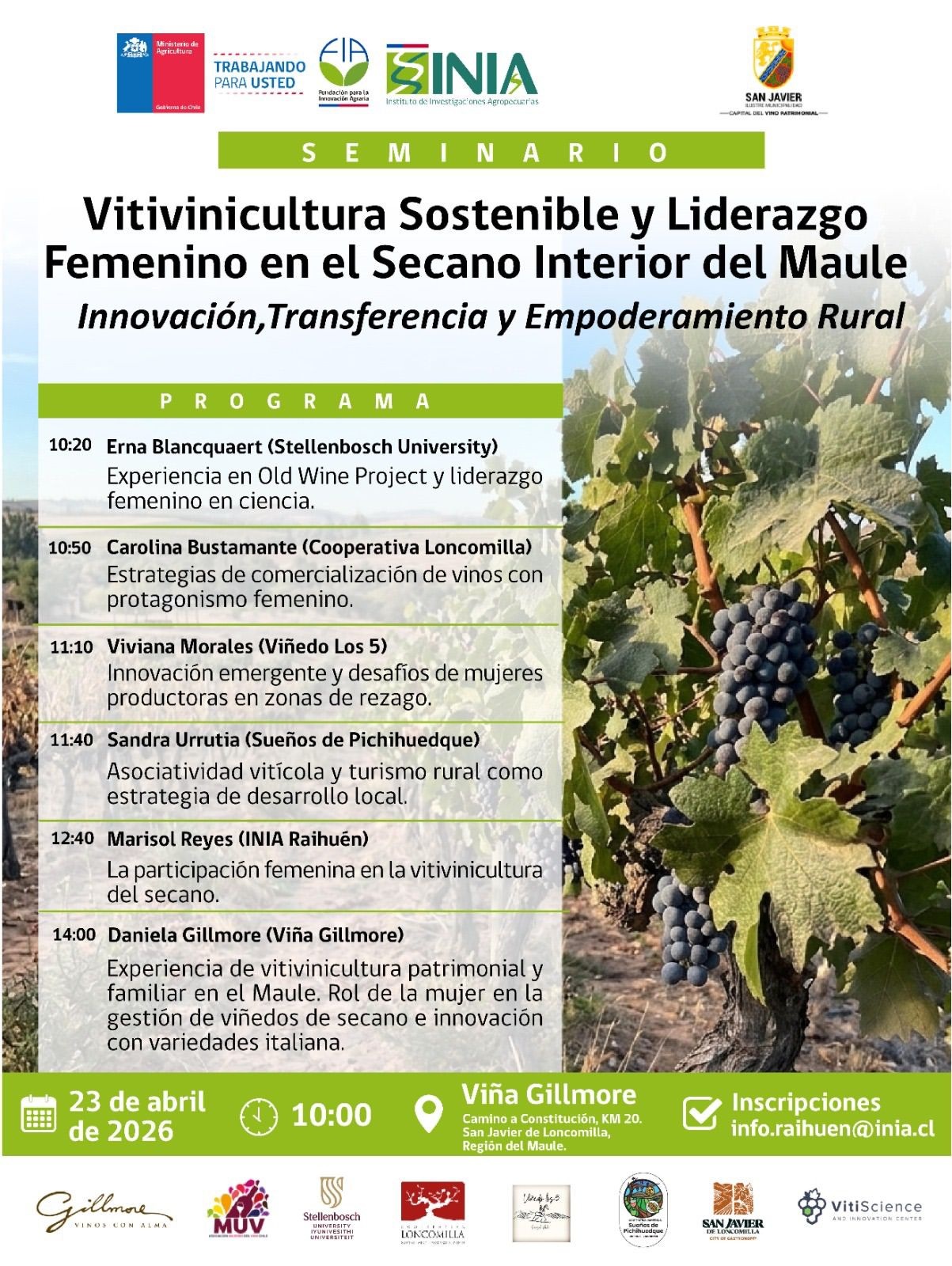 El próximo 23 de abril, el Viña Gillmore será sede del seminario “Vitivinicultura Sostenible y Liderazgo Femenino”, una instancia enfocada en innovación, transferencia de conocimientos y empoderamiento rural en el secano interior del Maule.