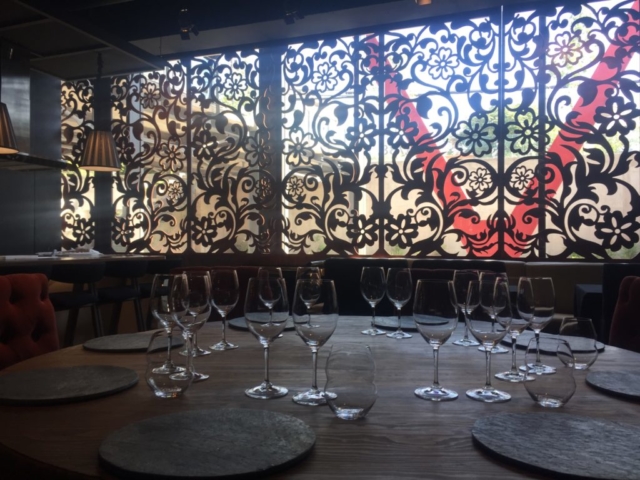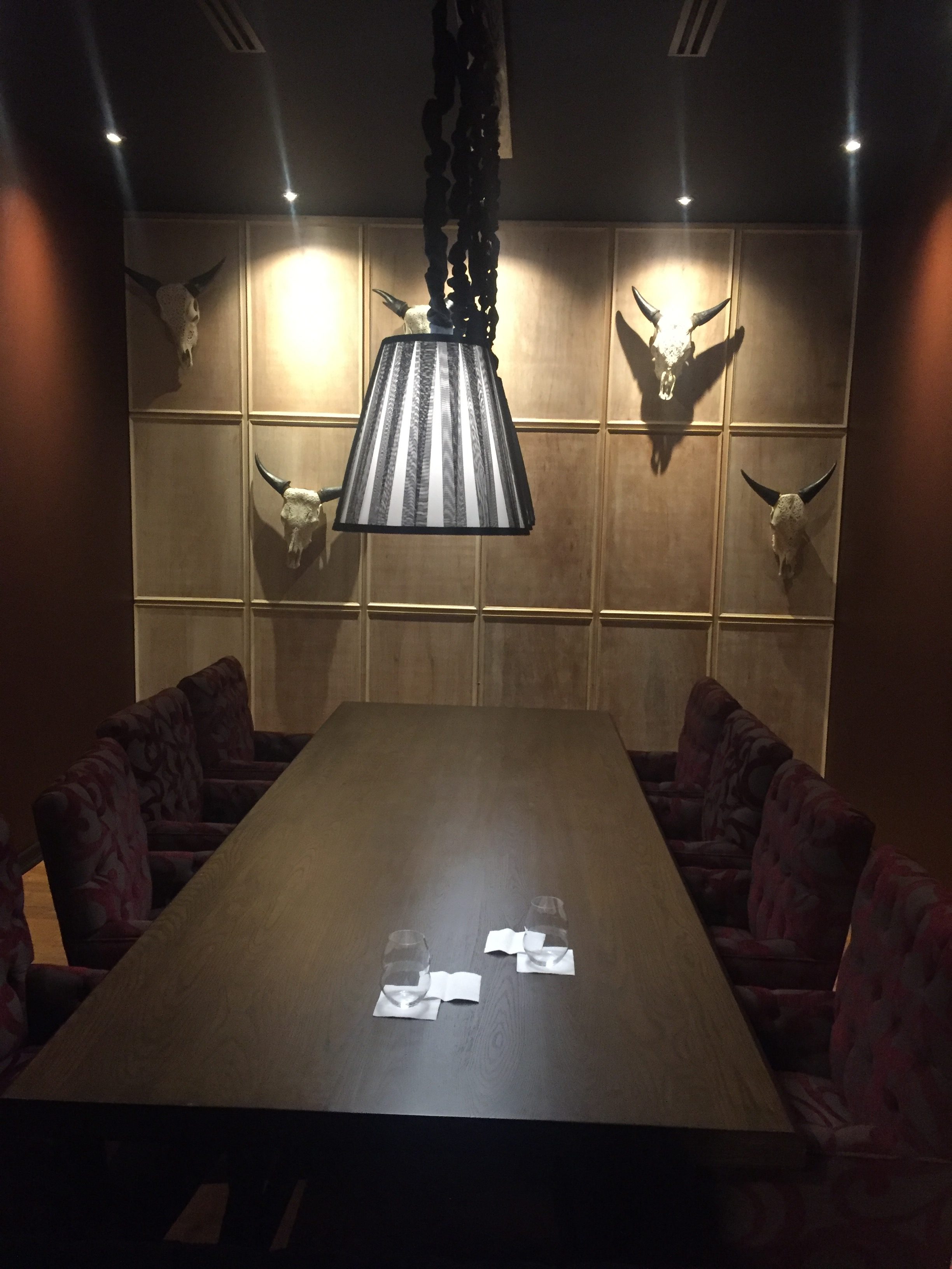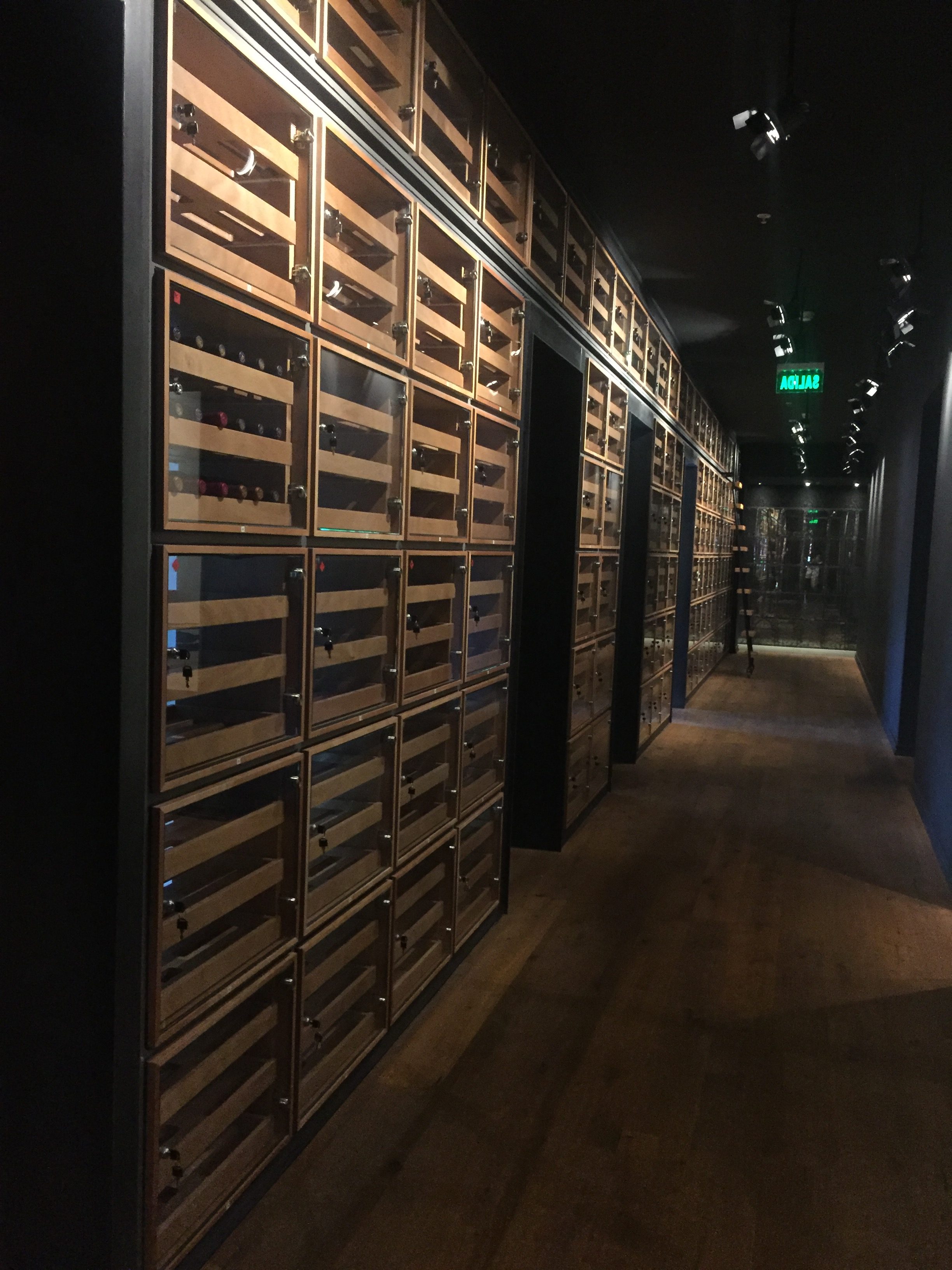 Cuando bajas las escaleras por Alonso de Córdova te encuentras la entrada con las chapas donde está identificado cada socio, están grabados a fuego, es un número limitado. Luego, lo primero que te encuentras dentro es el Lobby de Millesime, el restaurante que está abierto al público. Puede venir cualquiera y sentarse en esta magnífica mesa de mármol para 20 personas. Lobby es como la ante sala para entrar a Millesime, y a partir de esa cortina empieza el club Millesime Estudio. Allí te encuentras dos privados para los socios, y un gran pasillo con 100 cavas de vino, porque hay un tipo de membrecía que incluye la cava de vino.