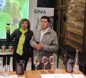 Marisol Reyes y Diego Arribillaga, ambos profesionales del INIA, durante lanzamiento de los nuevos vinos en Santiago.