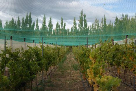 Cercos verdes de álamos para proteger del viento y mayas para proteger de los pájaros, son parte de las medidas tomadas para la producción de uvas para vino en la región de Aysén.