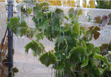 Heladas en verano (en la foto) y en primavera, se combaten con sistema de aspersores de agua para crear el efecto iglú.