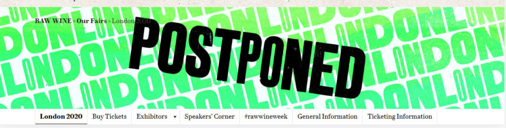 A la decisión de cancelar ferias internacionales a realizarse en los próximos meses (las que reciben miles de visitantes llegados de los cinco continentes) se suman, según informó Drinks International la feria de vinos naturales RAW LONDON 2020, agendada para el 8 y 9 de marzo, y la gran degustación bianual llamada Grands Jours de Bourgogne en Francia, programada para el 9 de marzo 2020. Ver aquí otras ferias 2020 ya canceladas.